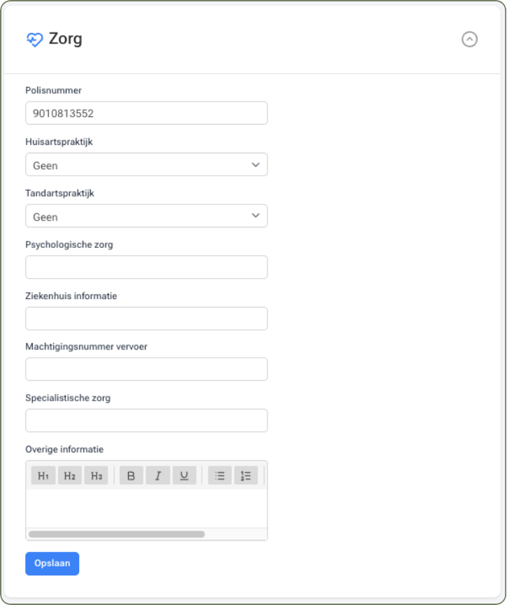 Ons platform maakt het mogelijk om medische gegevens veilig en overzichtelijk te registreren. De informatie is snel toegankelijk wanneer nodig. Denk aan medische informatie zoals: